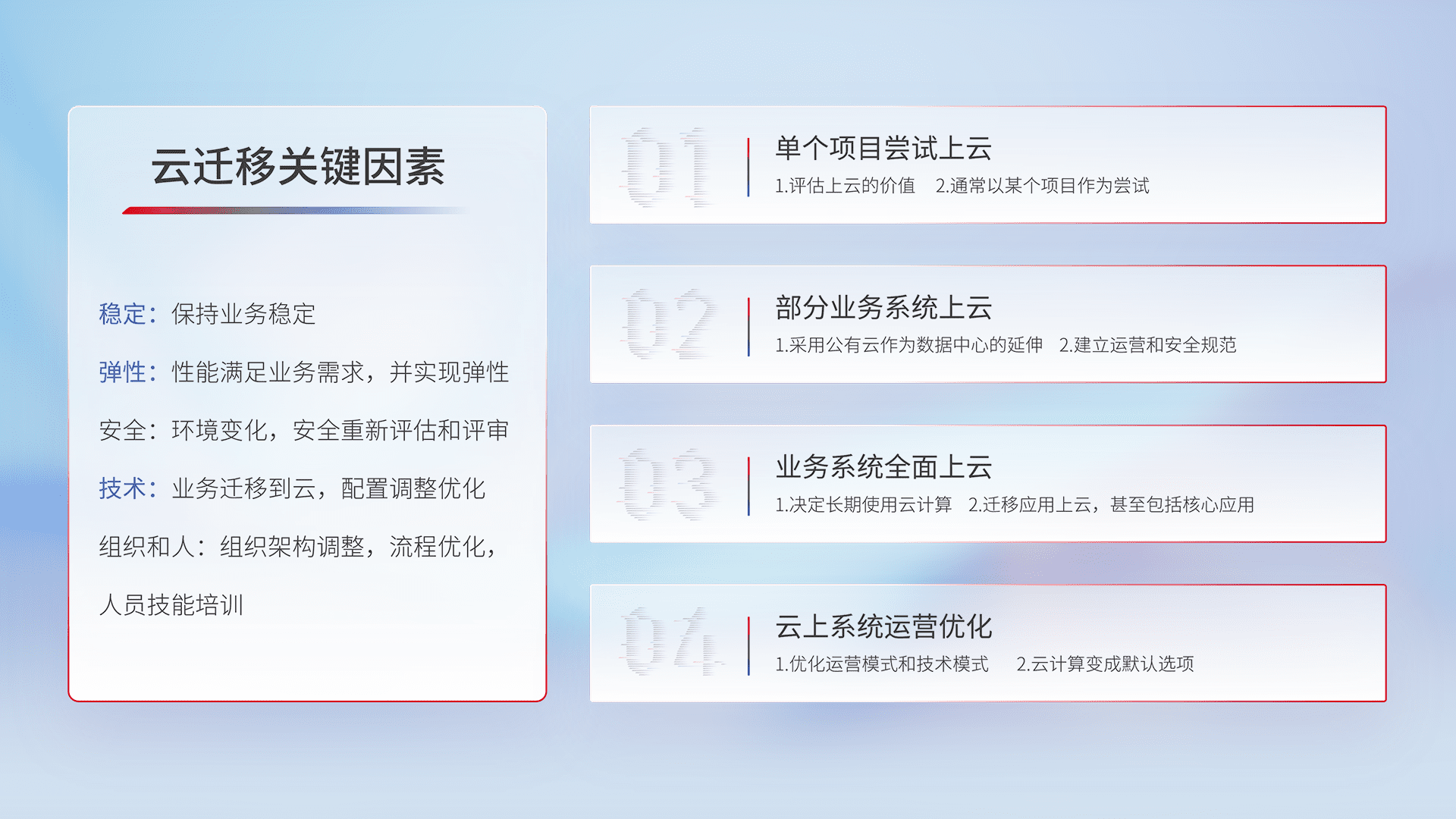 结合实际业务,,从规划设计、、、云平台选型、、、云原生改造、、、数据迁移、、、集成交付,,,,迁移全过程为客户识别最佳上云路径,,做好风险识别管理,,,,设计网络架构、、身份权限、、、、安全审计合规、、操作审计、、日志审计、、监控告警策略、、、、多站点容灾设计等,,,对云上基础设施进行整体规划,,提升IT治理水平,,以满足弹性、、、、高可用、、、高性能的需求。。