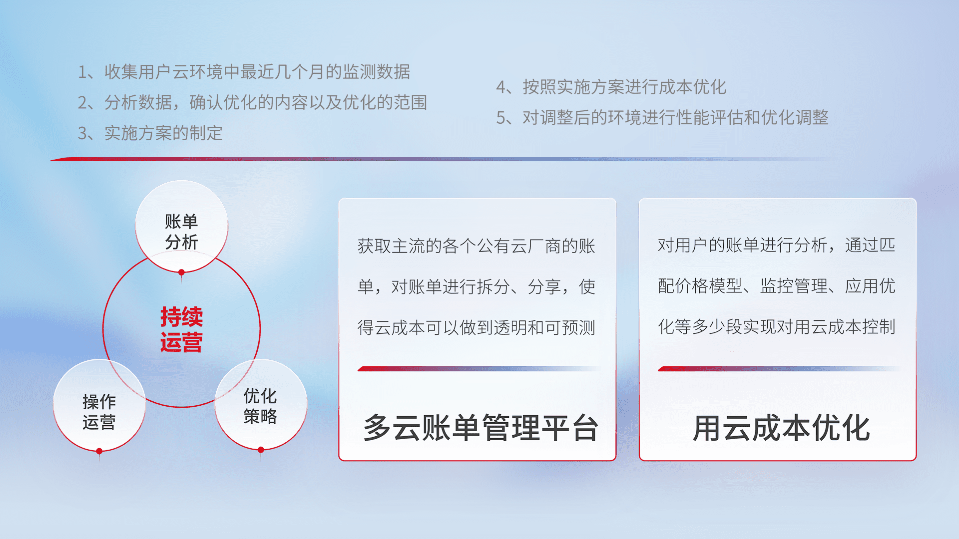 通过多云纳管,,,以统一的资源数据模型把客户的云资源进行抽象和封装,,进而实现对多云资源的统一操作,,保障云资源管理的可靠性、、稳定性与可用性。。。。量身定制化运维内容,,,配置、、、、开发运维、、补丁管理、、、、备份、、监控、、、认证和访问管理、、、审计和日常巡检等,,,,保障在用云过程中的可靠度,,稳定度以及高可用率。。。